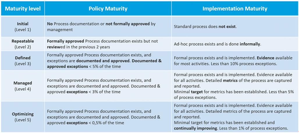The table below shows the different maturity levels and the definitions used to assess maturity from both perspectives: